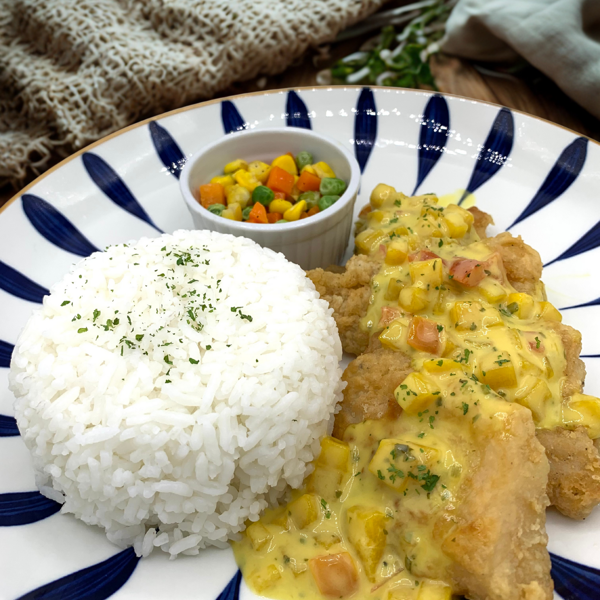 Cream dory with mango salsa served with steamed rice. Buttered veggies on the side